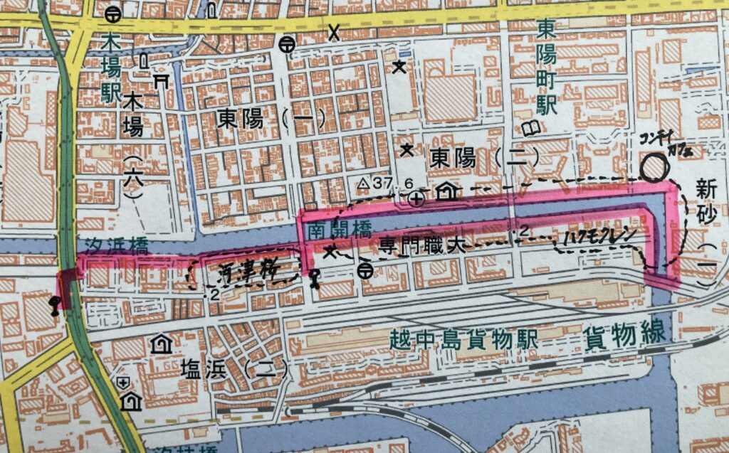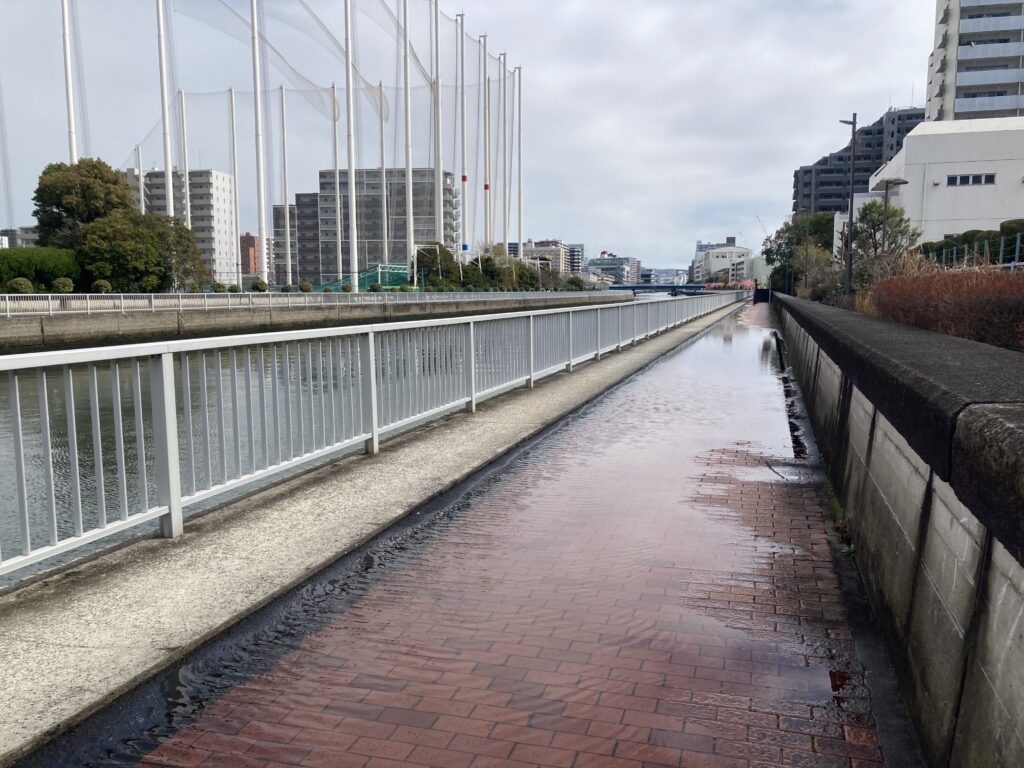 今回は路線バスを利用。業10を利用して「汐浜橋」で下車し、汐浜橋の手前から「汐風の散歩道」に入りました(早朝の雨で歩道の一部が水没していました)。