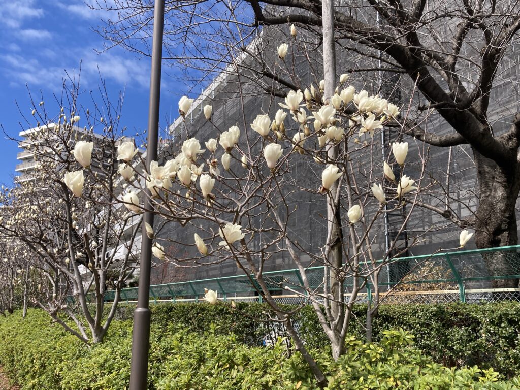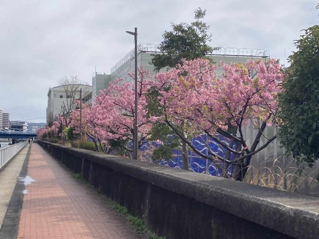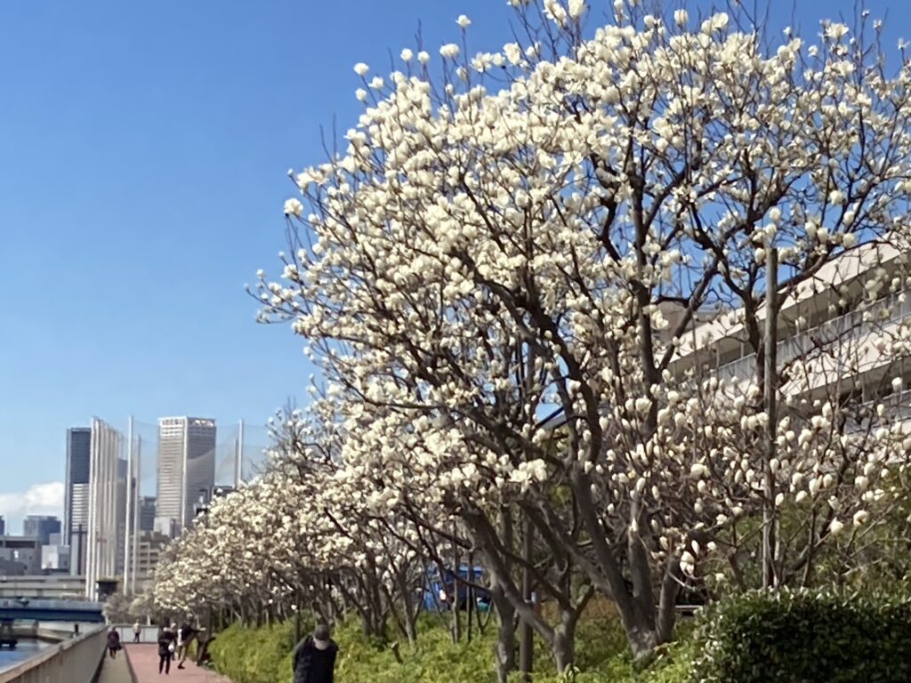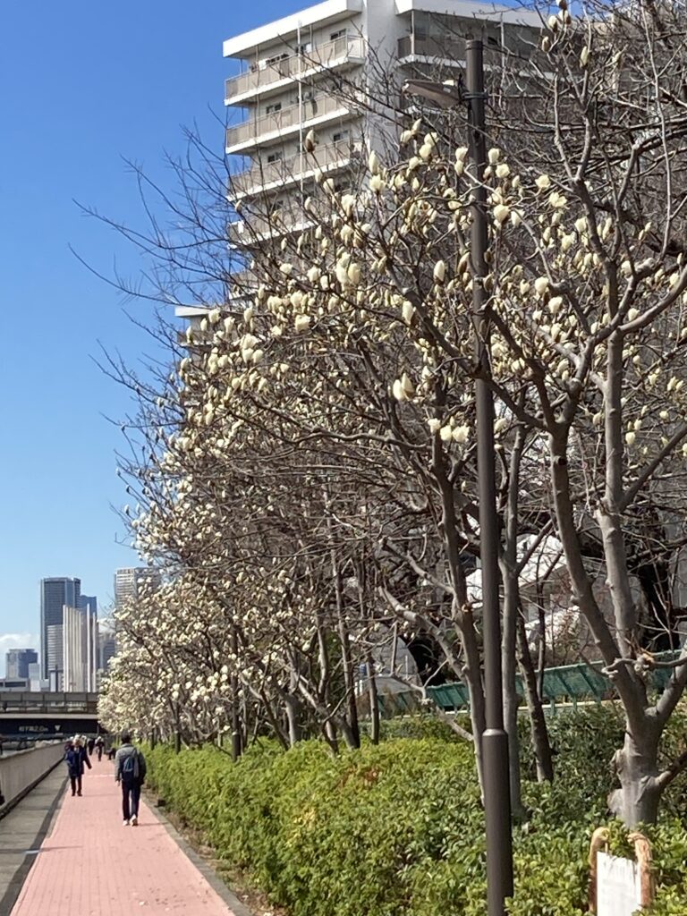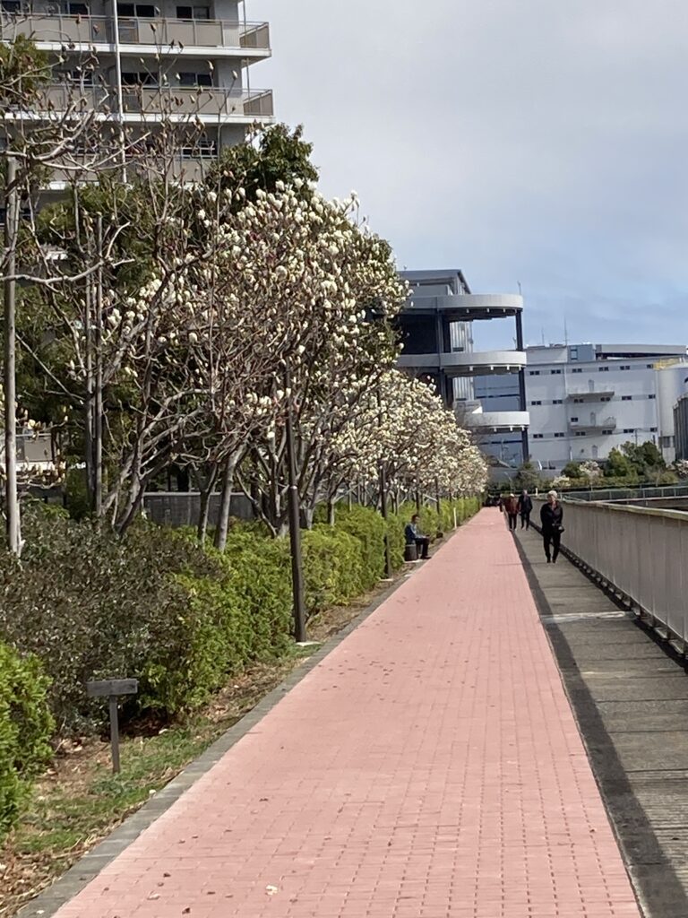 以前に早朝散歩した「汐風の散歩道」について「河津桜とハクモクレンが見頃」という情報があったので、行ってみることに。また前回の散歩で目をつけていた運河沿いのカフェスペースでランチする計画も盛り込んでみました。