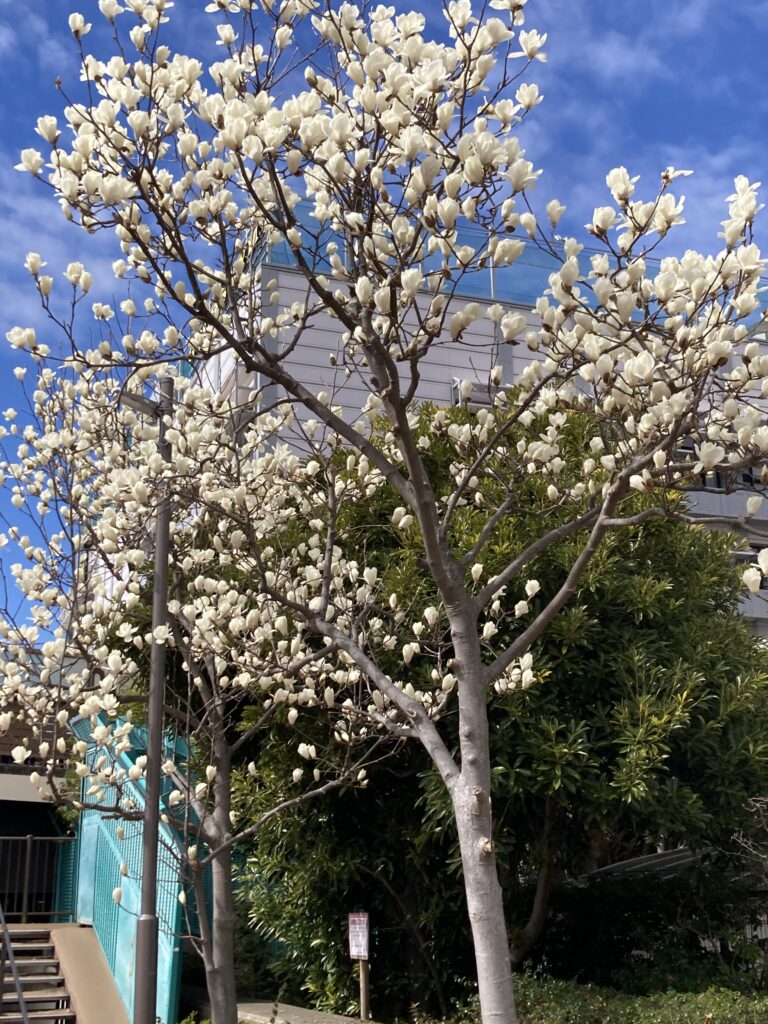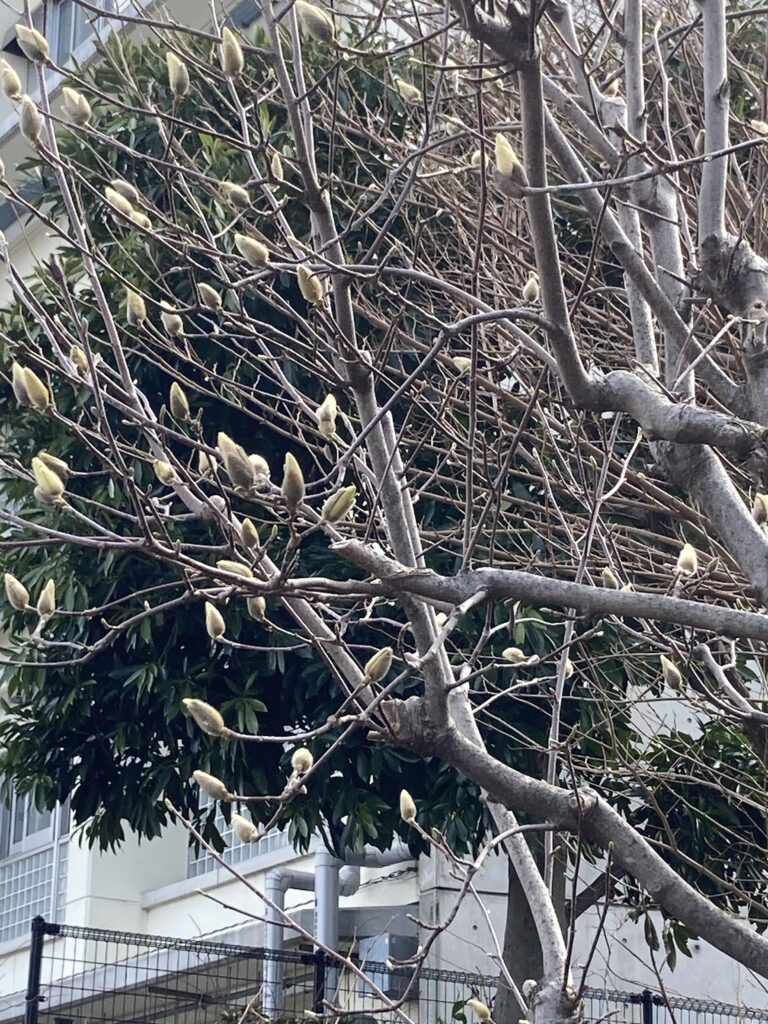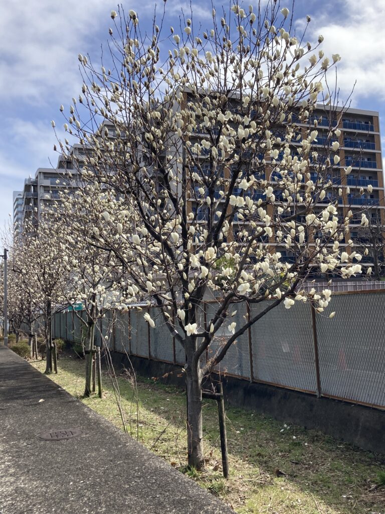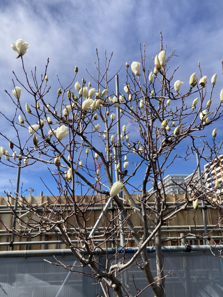 南開橋を過ぎると、両岸に「ハクモクレン」が植えられているエリアとなります。最初に歩く右側は日当たりのせいか、まだ写真のように蕾から少し花が開きかけの状態。