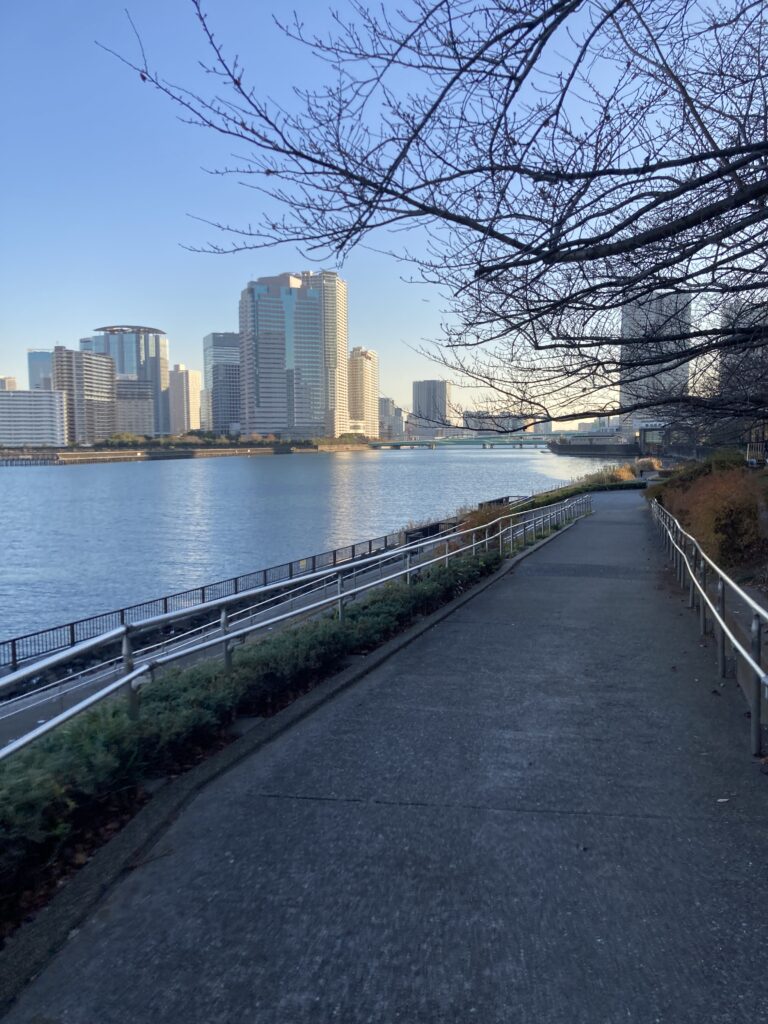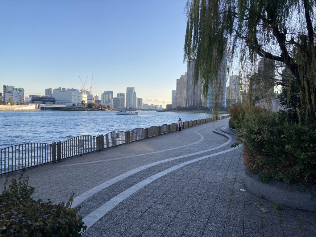 対岸に、先日散歩した越中島公園の遊歩道が見えました。