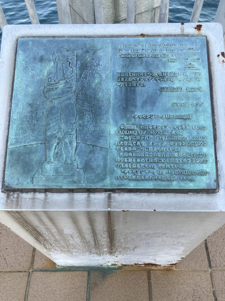 中央大橋の中央辺りにモニュメントが設置されていました。説明プレートは写真のように読みにくかったのですが、何かパリ五輪に関係するものらしいことが記載されていました。