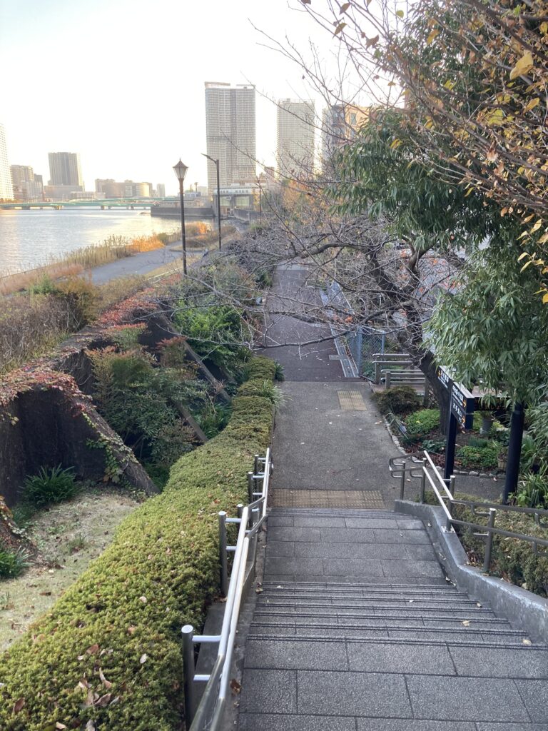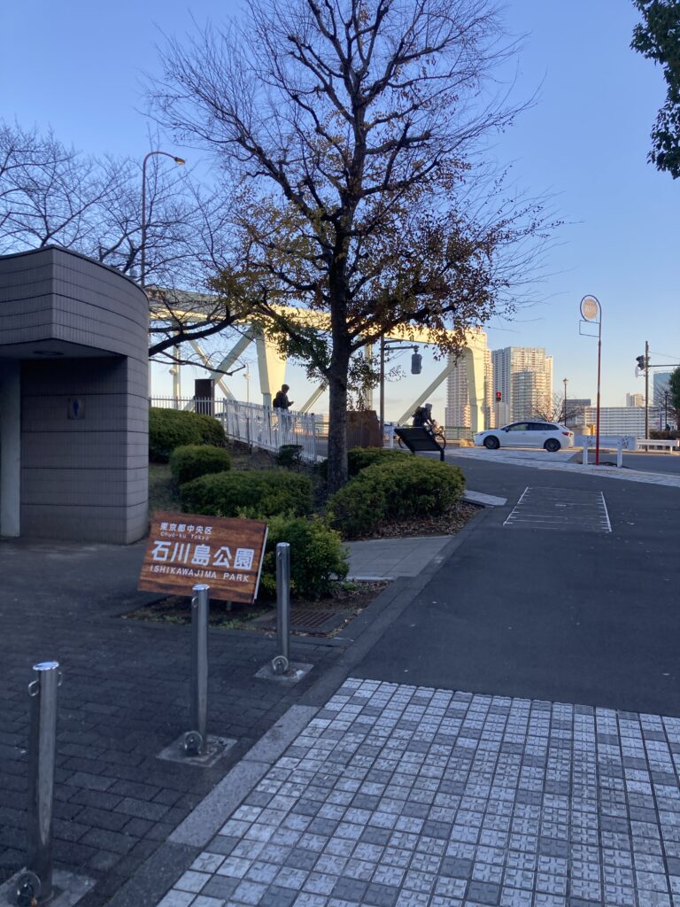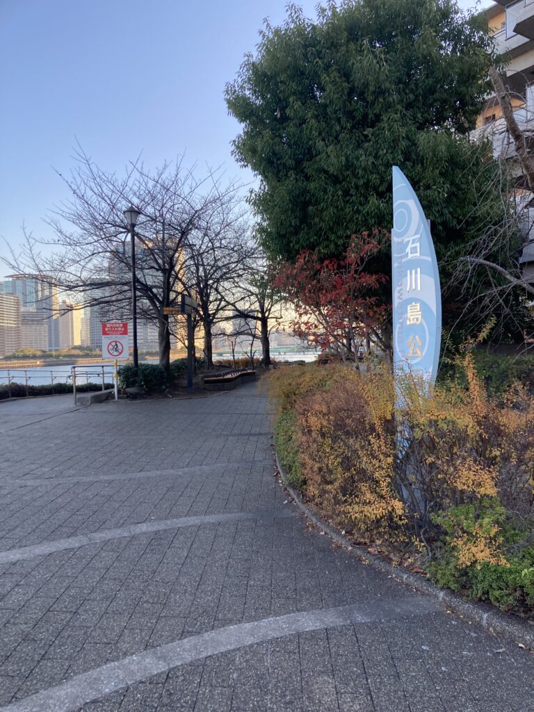 そのまま直進、突き当りから石川島公園に入りました(中央大橋を渡ったところで石川島公園に入っても良かったかもしれません)。
