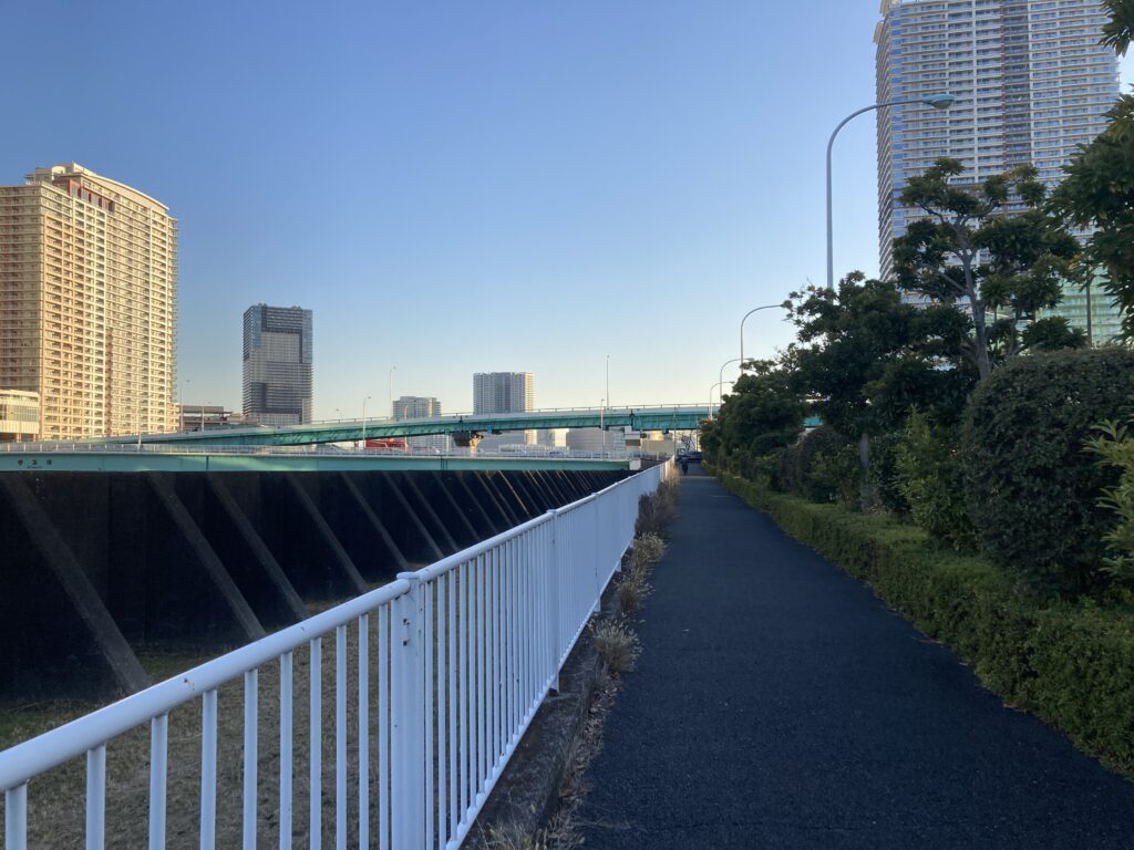 対岸の豊洲を眺めながら進み、突き当りの公園を抜け、帰路につきました。