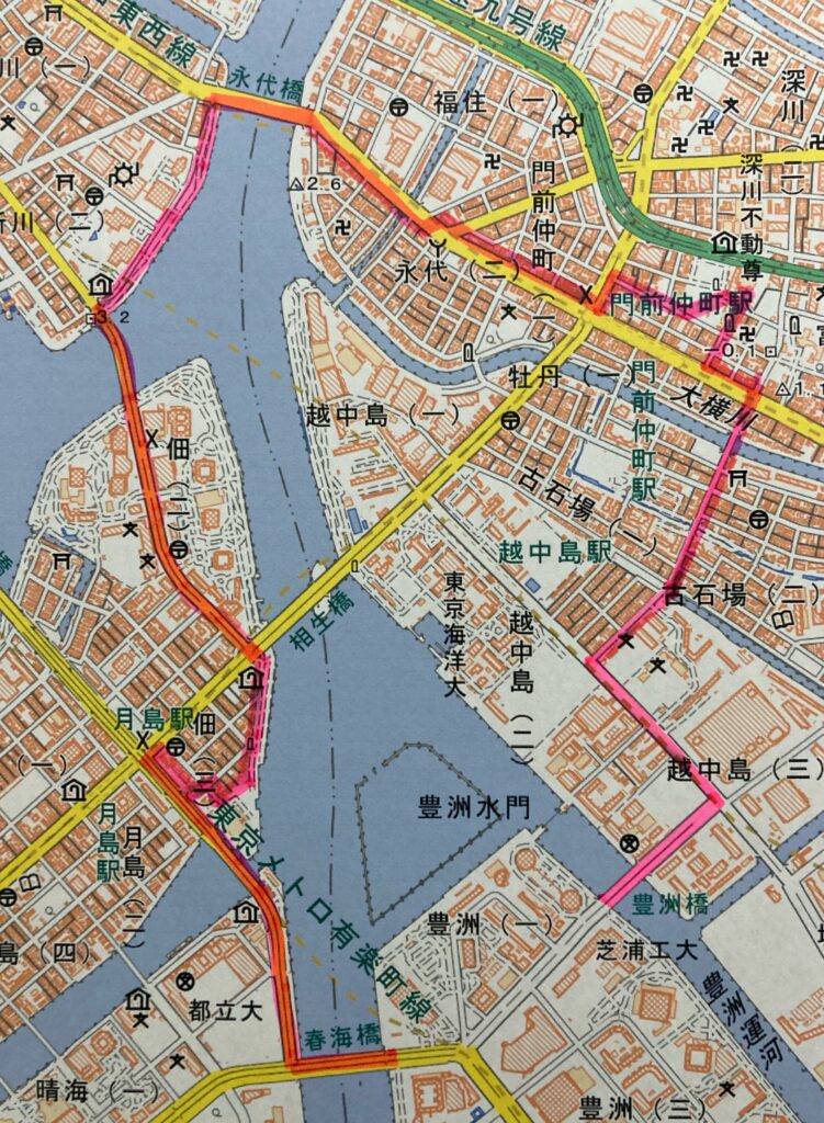 豊洲橋からスタート。まずは深川不動尊を目指し、越中島通りの途中で右折し、真っ直ぐ門前仲町方面へ。