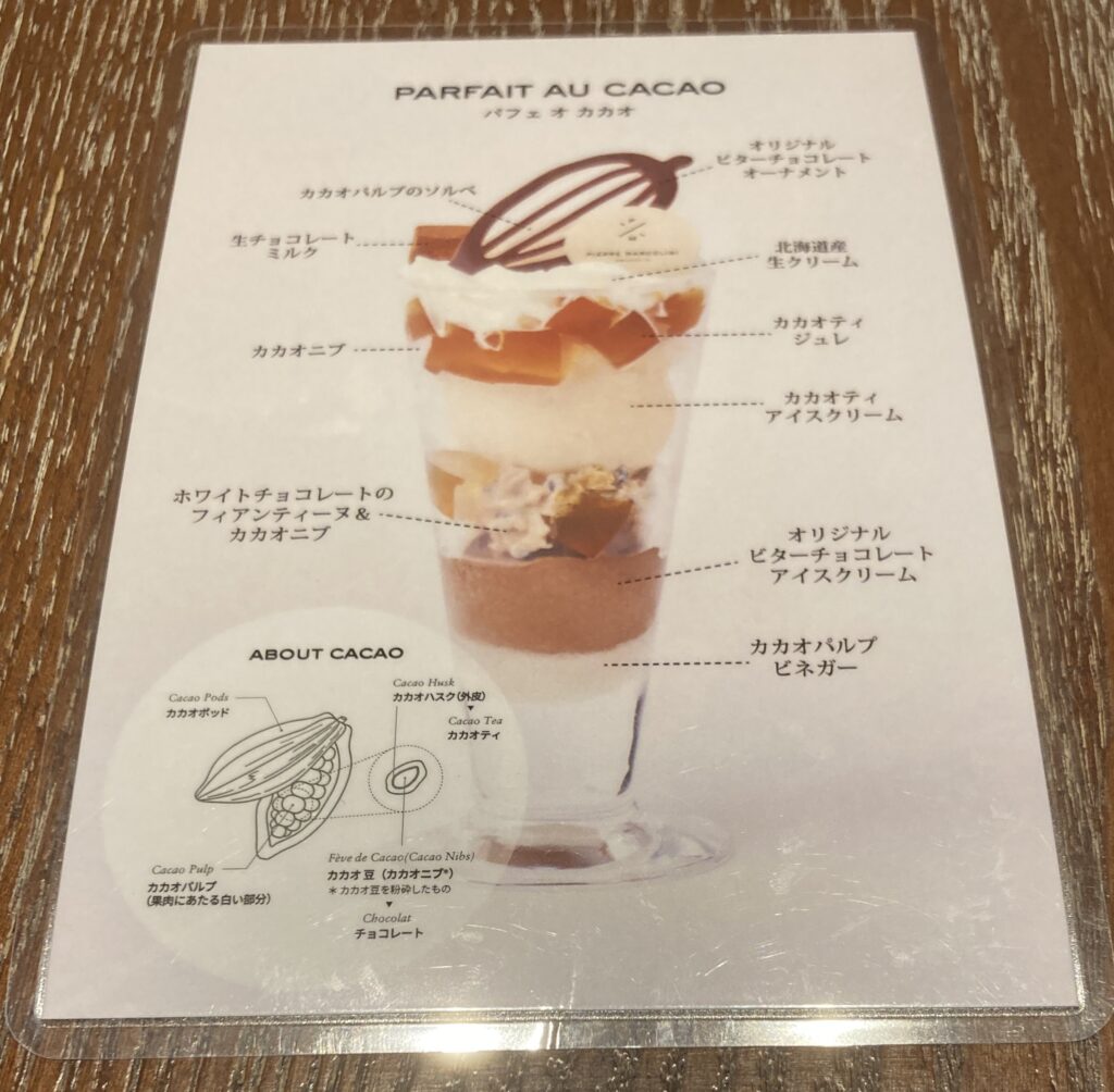 定番パフェ2種にシーズンメニュー2種が有りましたが、そのうち2月20日までのバレンタインメニューという「パフェ オ カカオ」を注文(1人で来てこのメニューを頼むのもどうかと思いましたが、店員さんが「このメニュー目当てに1人で来る方もいる」とのことだったので)。