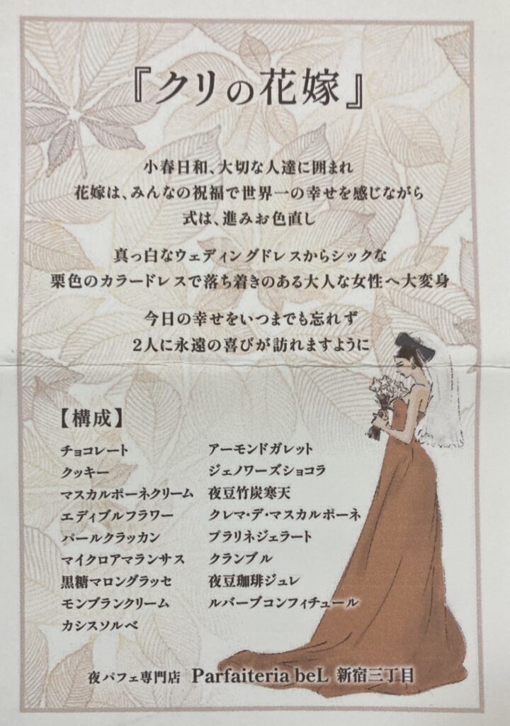 メニュー表には6種類程度載っていたと思いますが、悩んだ結果、「クリの花嫁」という季節限定メニューをオーダー。