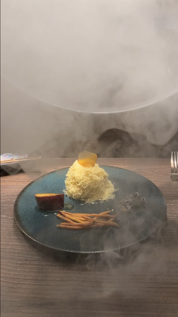 カウンターに席を取り、従業員の方が眼の前でセットを作っていたのですが、何やらドーム状のものをかぶせています。「それは何か?」と聞いたところ、芋フレーバーを注入するとのこと。蓋を取るとほんのり芋の香りが。