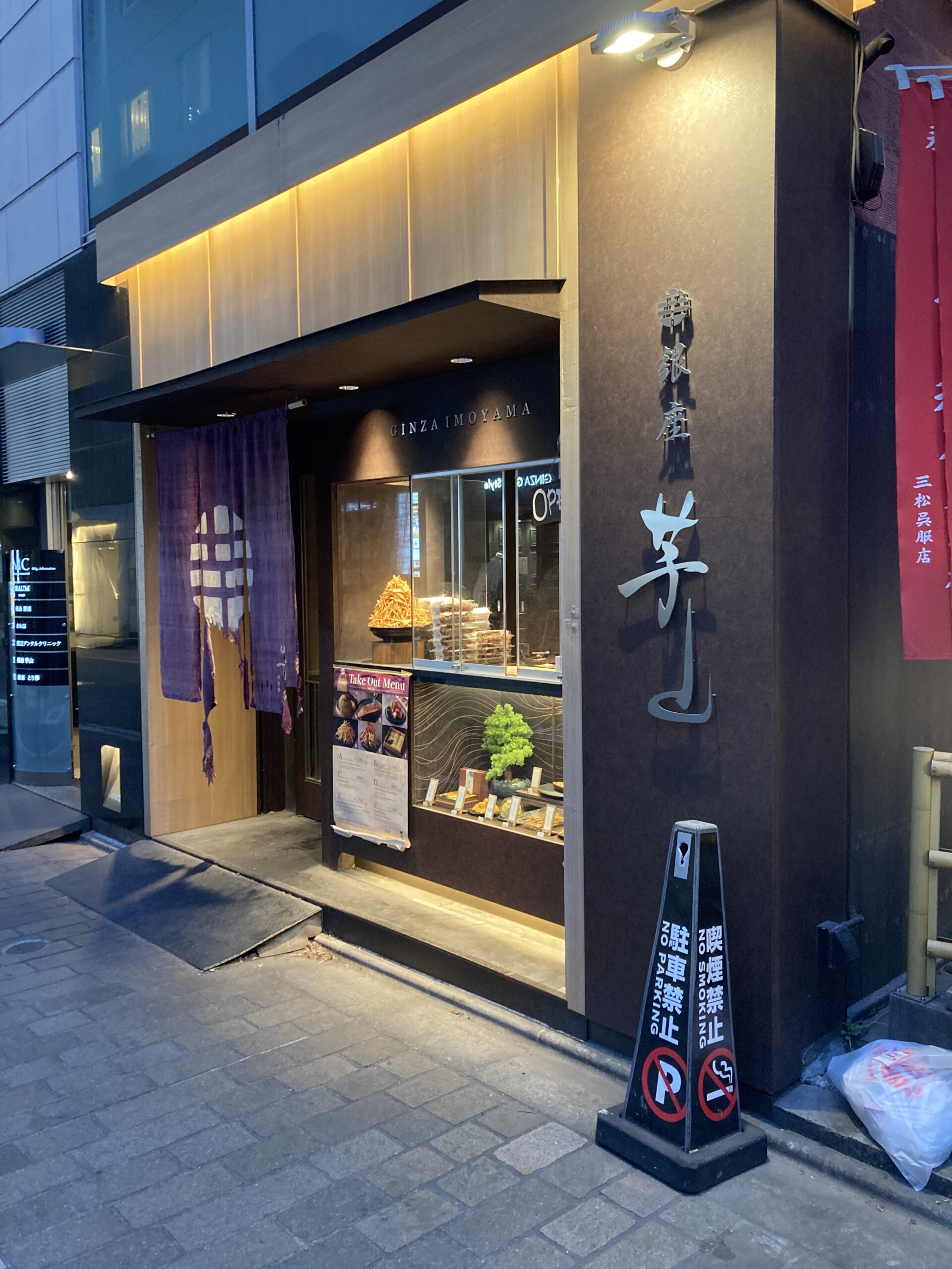 所要のついでに、月一スイーツのお店を探していて、銀座のあるお店に行くつもりで、銀座四丁目バス停を降り、すぐ先の路地を曲がったところ、和スイーツのお店が目に止まりました。「銀座芋山」、お芋スイーツの専門店です。